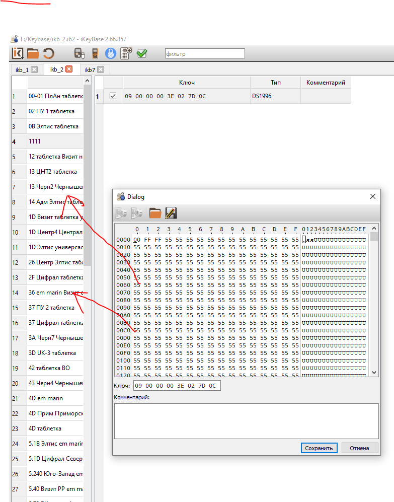 Я наверное не очень ясно выразился. Есть запись в базе, она имеет вид не Dallas, а DS1996, а в ней куча строк. Что-то, наверное, с кодами ключей, записанных в память домофона, что-то вероятно какие-то другие данные. Как из записи этого типа DS1996 извлечь все записи ключей Dallas в новую или текущую базу ikeybase ? Это делается автоматом каким-то экспортом-импортом или вручную надо выписывать или копировать строчки? Ну и вдогонку. Как базу ключей распечатать на бумагу с комментариями и значениями дампов?