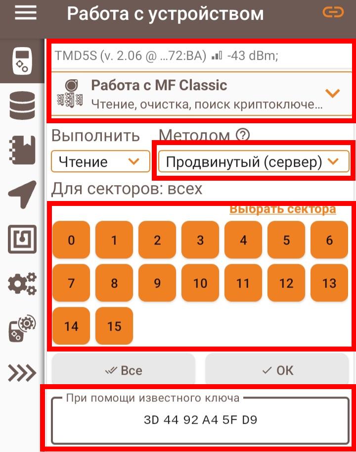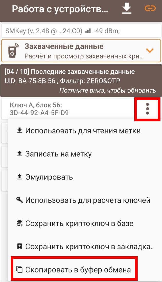 Порядок действий следующий: для начала на SMKey - Меню > UID > считать для захвата - приложить оригинальный ключ, сделать захват криптоключей от домофона. В приложении в списке полученных криптоключей возле любого из них нажимаем три точки > скопировать в буфер обмена. Отключаем SMKey, подключаем TMD 5S. В меню работы с TMD 5S выбираем режим "Работа с MF Classic". В вышедшем окне выбираем выполнить чтение методом "Продвинутый (Сервер)". Для секторов - выбираем "ВСЕ". При помощи известного криптоключа - в это поле вместо FF нужно вставить скопированный ранее захваченный с помощью SMKey криптоключ (который был скопирован в буфер обмена). Нажимаем начать. Начнется процесс, в результате которого ключ будет полностью считан. Дальнейшие действия описаны в видео, которое выше уже советовали посмотреть. Примечание: метод копирования предназначен в основном для домофонов серии 5000. Скрины и фото прилагаются.- Копирование защищенного mifare