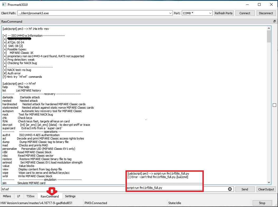FYI: лучше конечно обновить прошивку и сделать все в ProxSpace Eсли у вас ключ Mifare Classic 1k (ISO 14443-A tag) проверить это можно командами: hf search или hf mf info попробуйте вот эти 2 скрипта : fm11rf08s_recovery.py fm11rf08s_full.py проверить наличие скрипта в клиенте командой: script list потом запуск этих двух скриптов: script run fm11rf08s_recovery.py или script run fm11rf08s_full.py PS: если достанет ключи , то покажет много инфы по карте